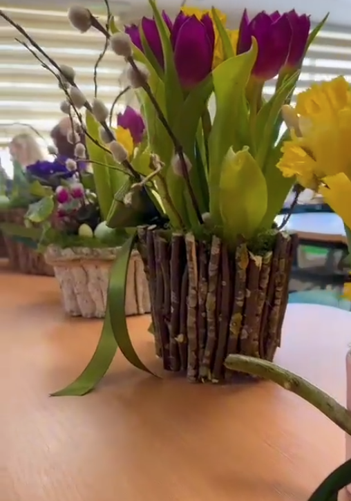 Viesmīlības pakalpojumu speciālistu un viesmīļu profesijas nedēļas ietvaros 405. grupa veidoja ziedu kompozīcijas "Pavasara ziedu burvība"